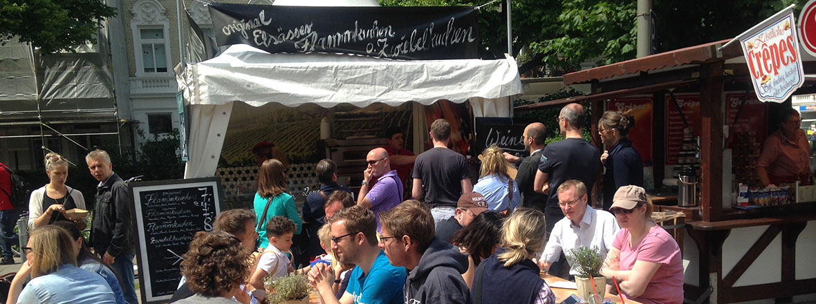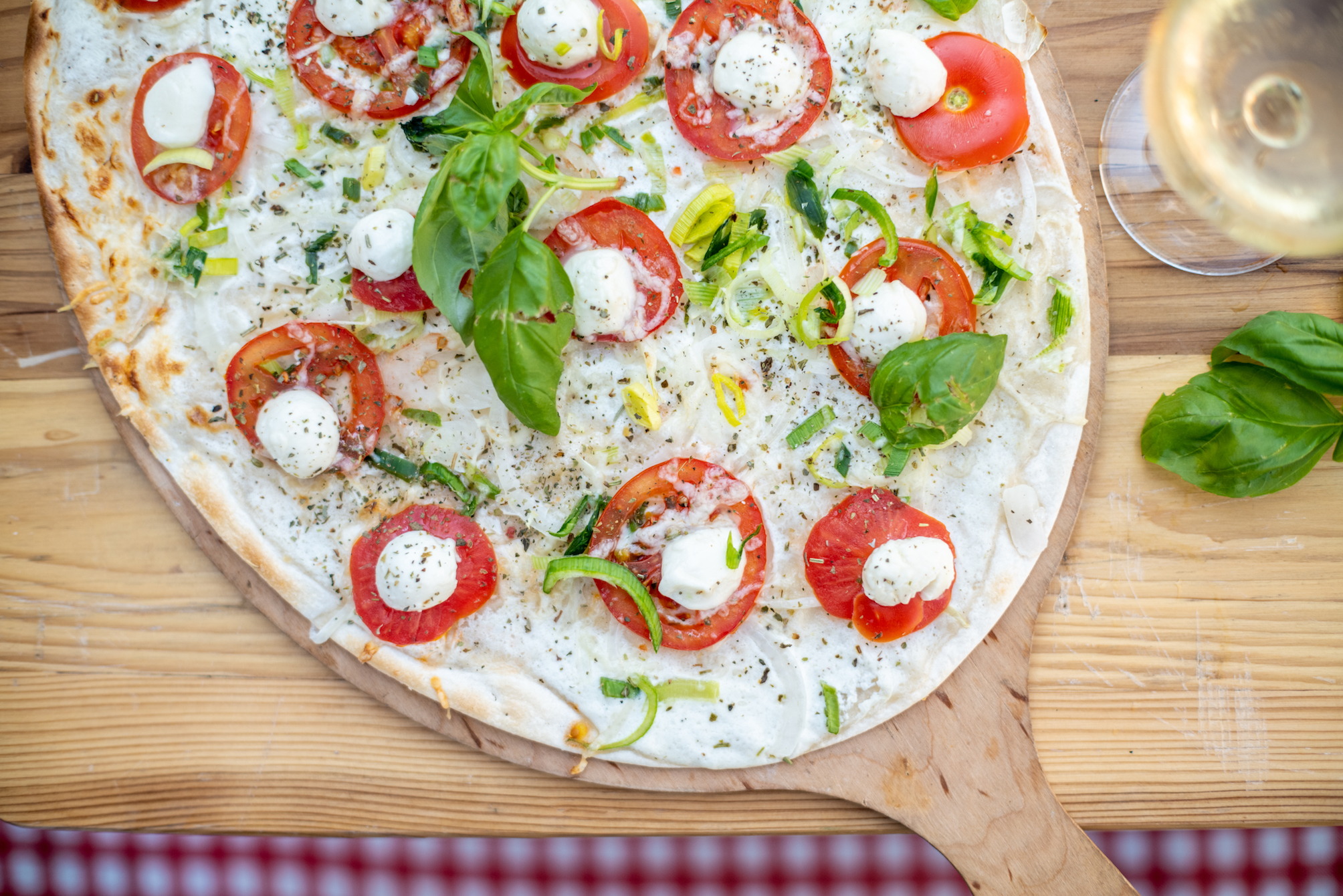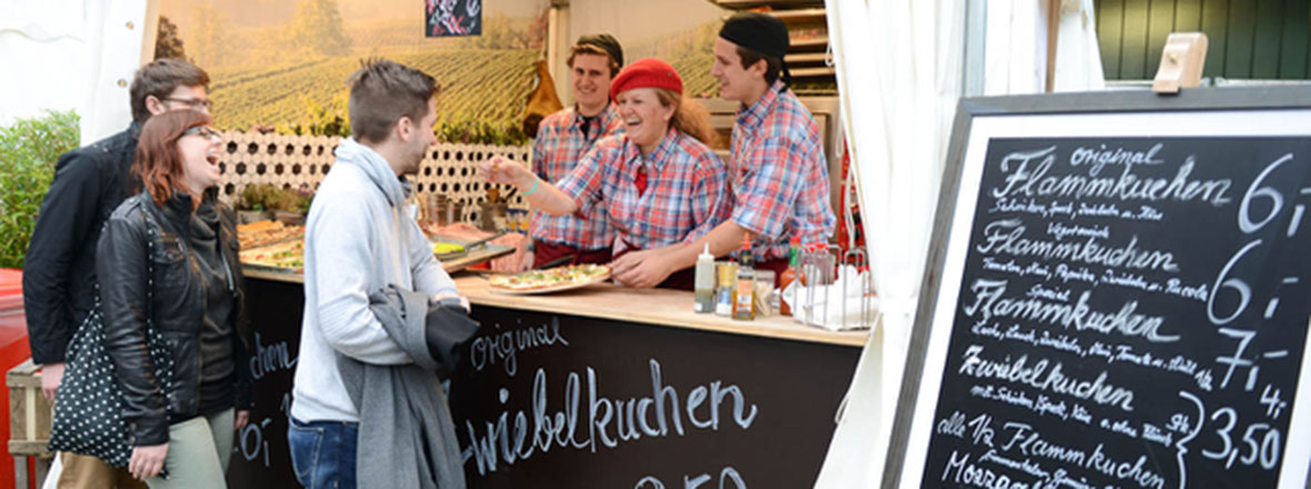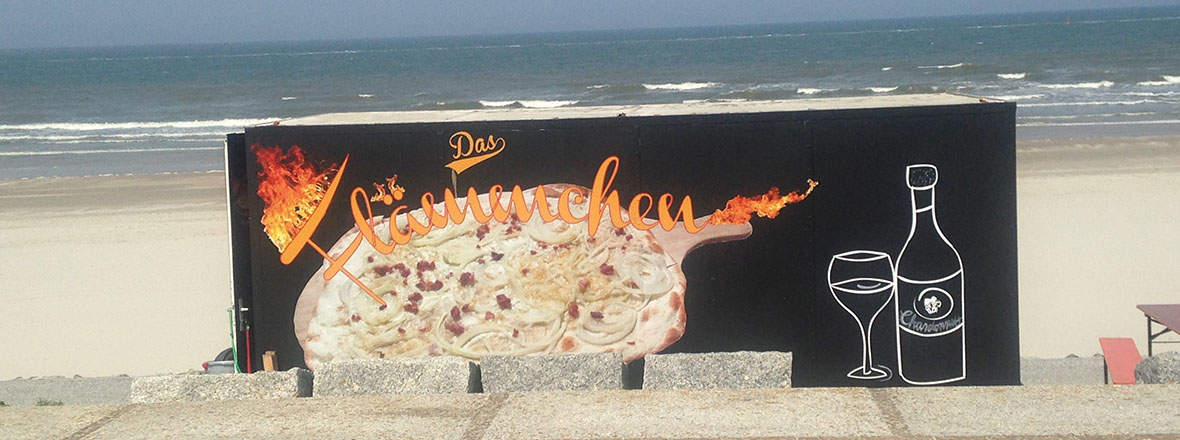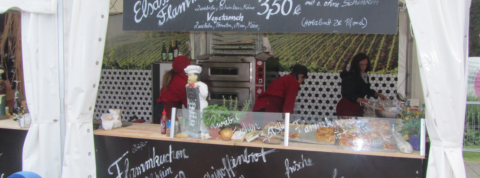 Vielseitig Ich werde Stück für Stück immer frisch und von Hand belegt. So kann ich prompt und sehr individuell auf die Vorlieben jedes Gastes eingehen. Dabei bin ich so vielseitig, dass garantiert für jeden etwas dabei ist. Ob klassisch rustikal mit Speck und Zwiebeln, exquisit mit Räucherlachs oder Gorgonzola, vegetarisch mit frischem Gemüse, oder vegan mit selbstgemachter Sauce, frischem Gemüse/Kräutern und leckerem Pesto – ich habe für jeden Geschmack das passende Outfit! Flammkuchen und Wein gehören zusammen, wie das Amen in der Kirche. ich haben das passende Getränk im Gepäck: je nach Saison komme ich mit ausgewählten französischen Weinen, Fruchtschorlen aus der Mosterei unseres Nachbardorfes, oder mit prickelndem Federweißen.