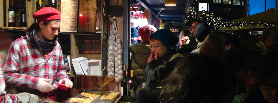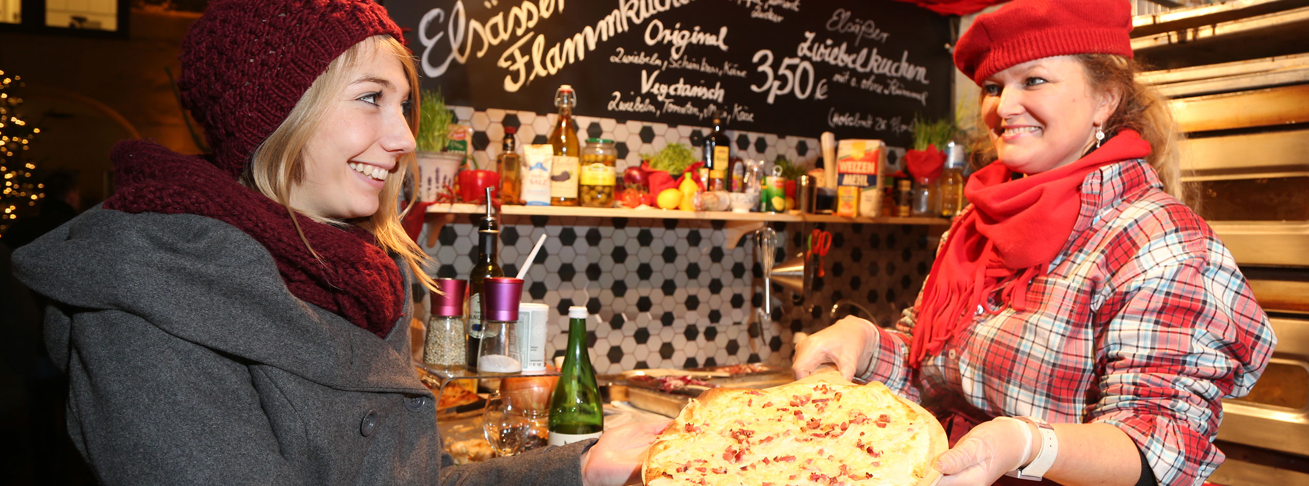 Unser Sortiment Je nach Jahreszeit, servieren wir frisch zubereiteten Flammkuchen mit verschiedenen Belägen. In der Sommerzeit gibt es zum Beispiel Flammkuchen mit Apfel und Eis und im Winter den ganz traditionellen mit Schmand, Zwiebeln und Speck. Natürlich auch Flammkuchen vegetarisch, mit verschiedenen Gemüse- und Kräuterarten.
